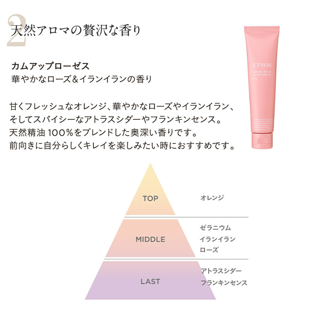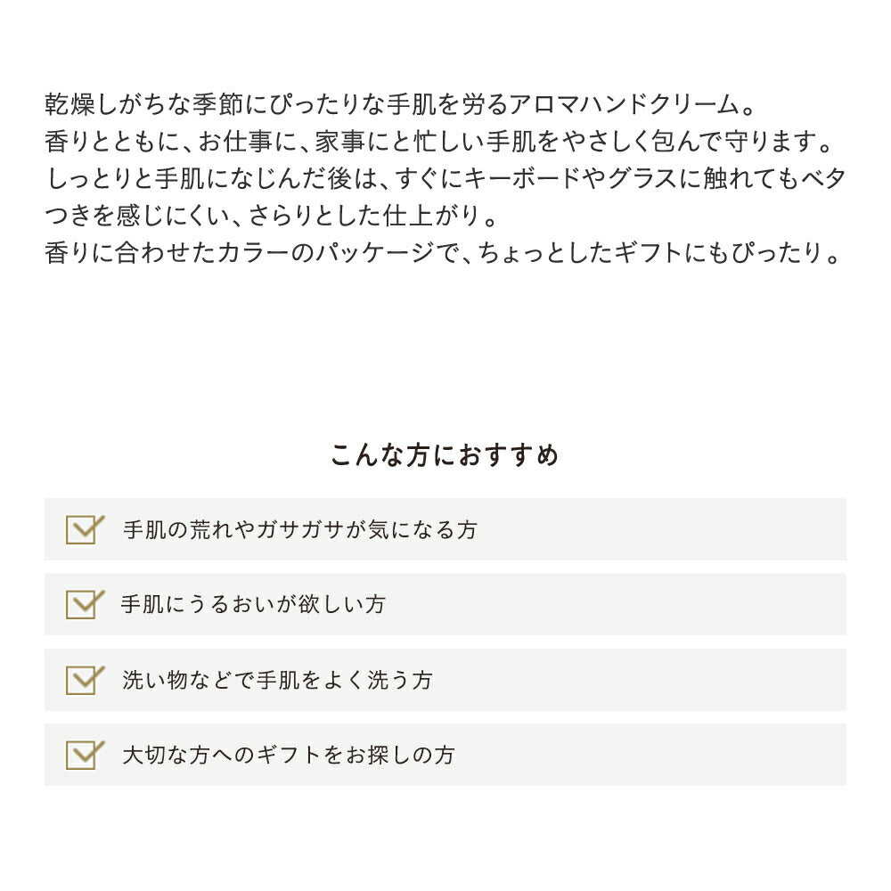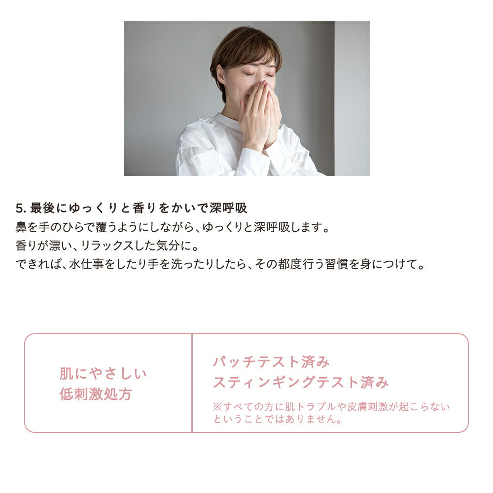The "Come Up Roses" scent features the glamorous fragrance of roses and ylang-ylang. These scents gently envelop and protect your busy hands, whether at work or doing household chores. After the cream is absorbed, it leaves a smooth finish that is not sticky, allowing you to immediately touch keyboards or glasses. The packaging color is matched to the scent, making it a perfect little gift.