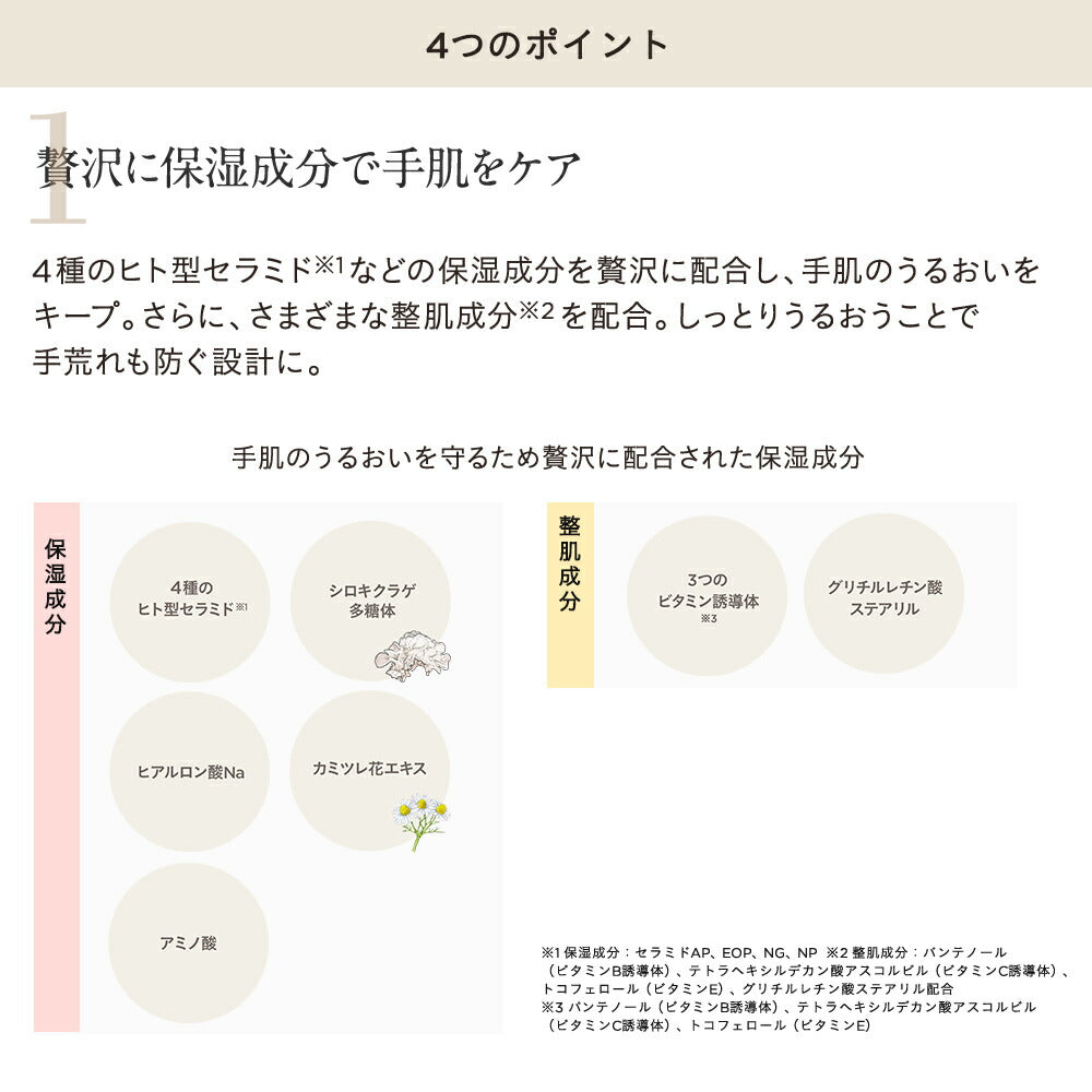A perfect hand cream for the dry season, this aromatic hand cream pampers your skin. It is formulated with a luxurious blend of moisturizing ingredients, including four types of human-type ceramides (moisturizing ingredients: Ceramide AP, EOP, NG, NP), to keep your hands hydrated.