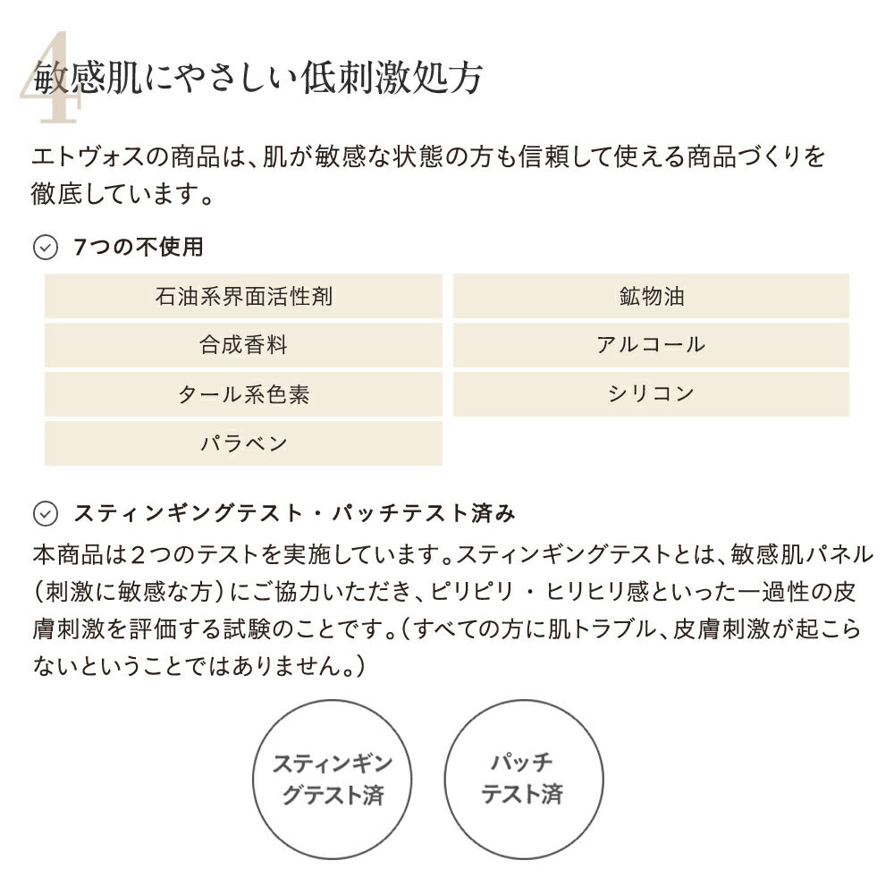 The skin-conditioning ingredients include panthenol (vitamin B derivative), tetrahexyldecyl ascorbate (vitamin C derivative), tocopherol (vitamin E), and stearyl glycyrrhetinate.