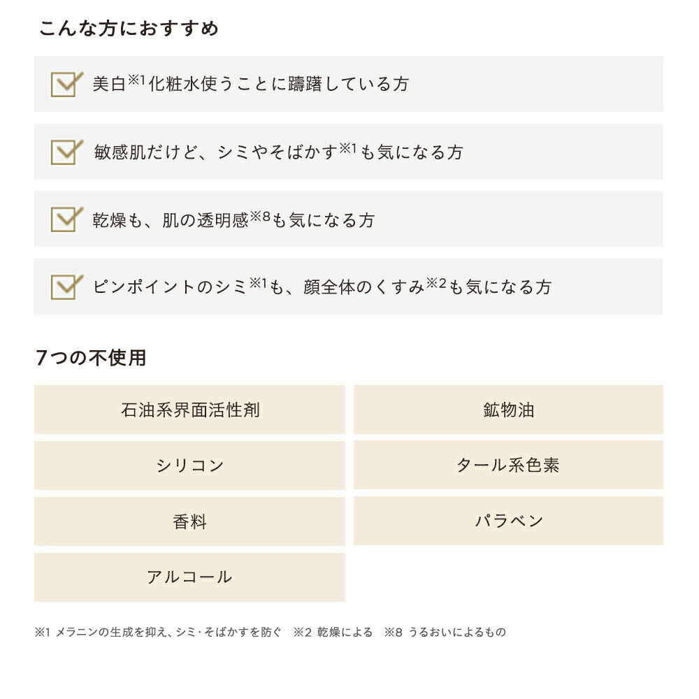 Quickly approach the early signs of damage that cause spots and dullness with a refreshing and moisturizing medicated whitening lotion. Suppresses the production of melanin, preventing spots and freckles due to dryness.