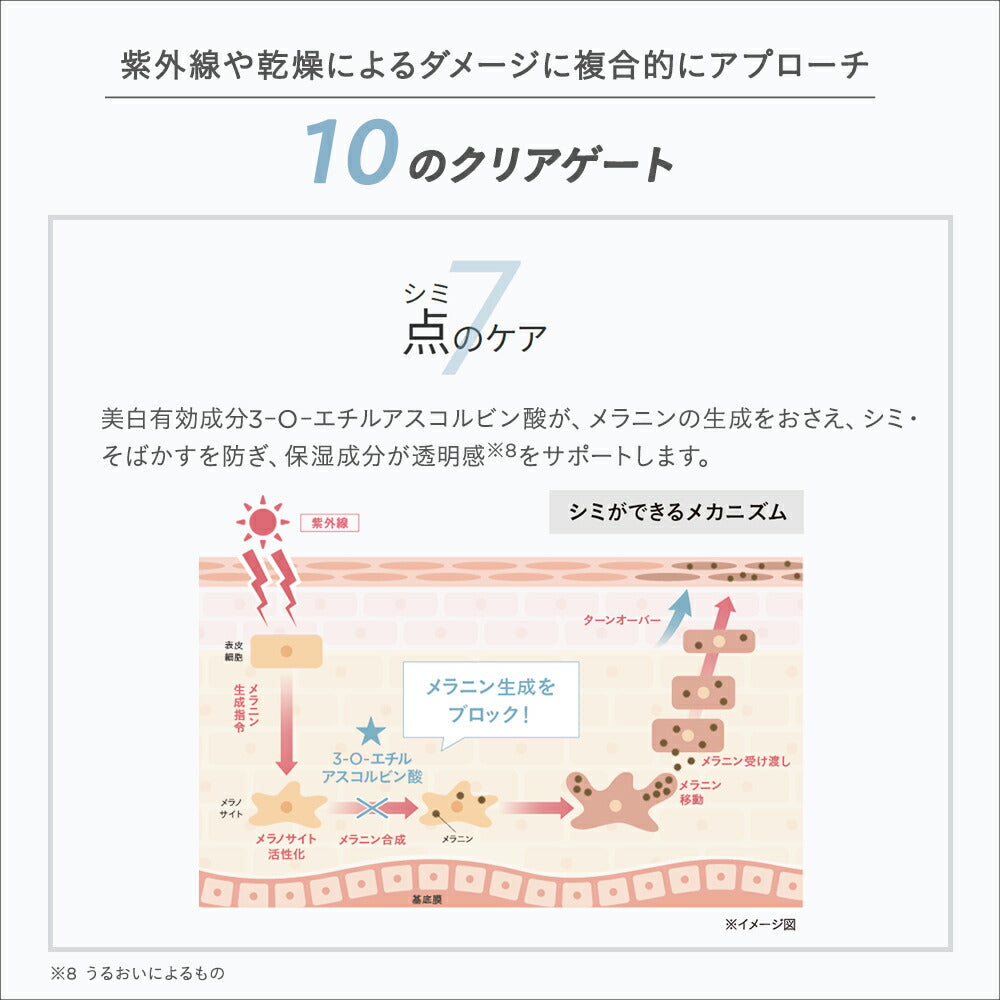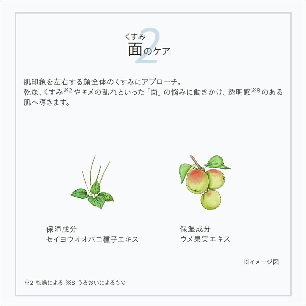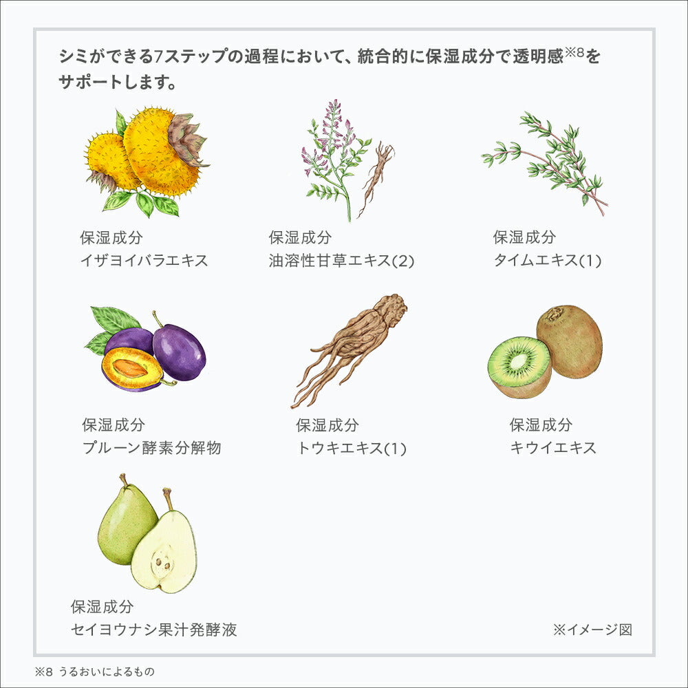 POINT 1: Angelica keiskei fruit extract (a moisturizing ingredient) quickly approaches the initial reactions that cause "premonitory damage" to spots and dullness, keeping the skin healthy.