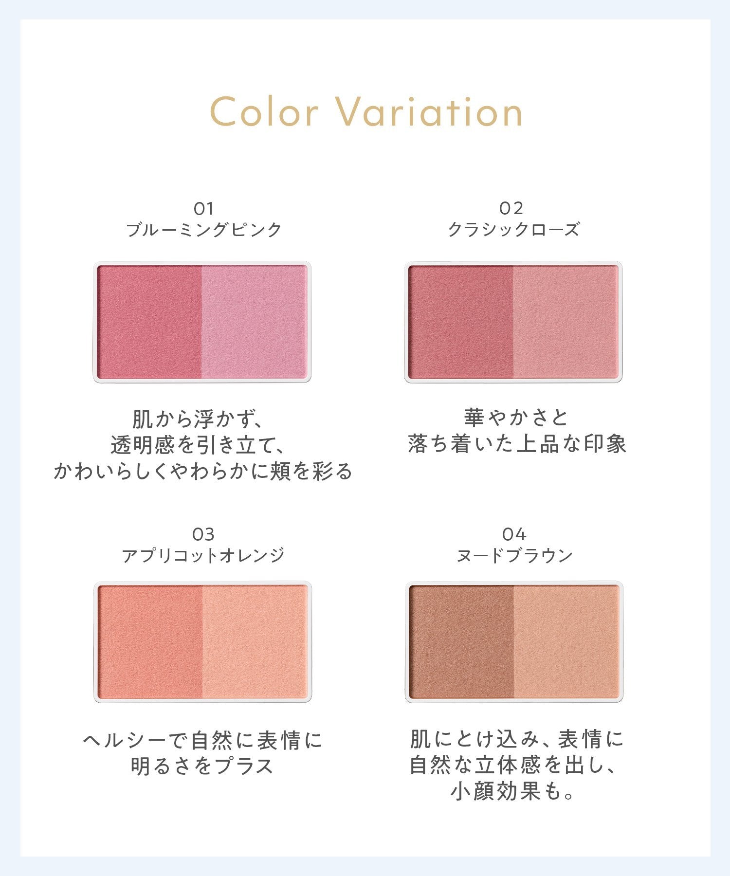 A powder blush that combines two shades to create natural dimension and a translucent, healthy-looking glow. It enhances the beauty of bare skin.