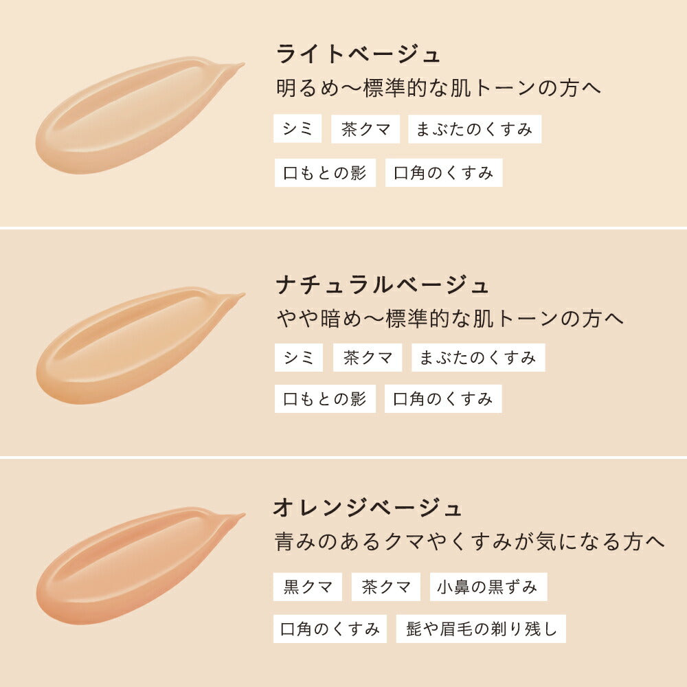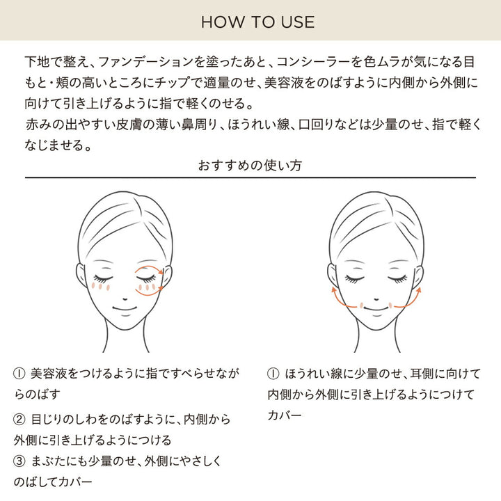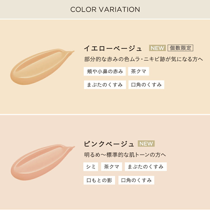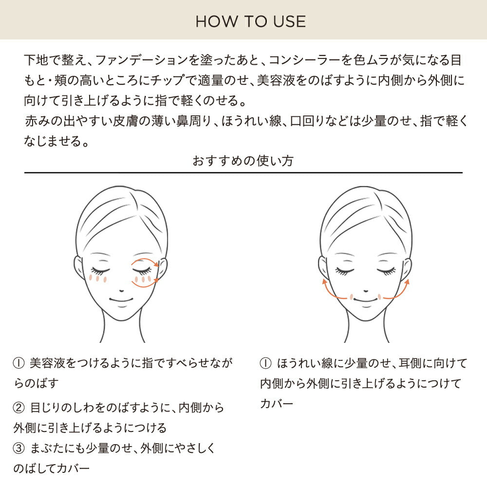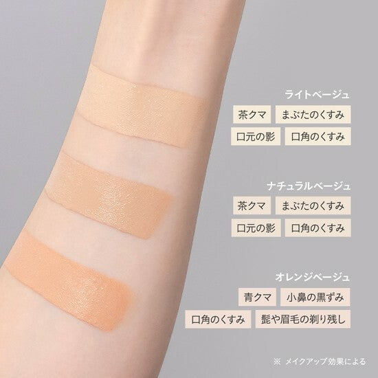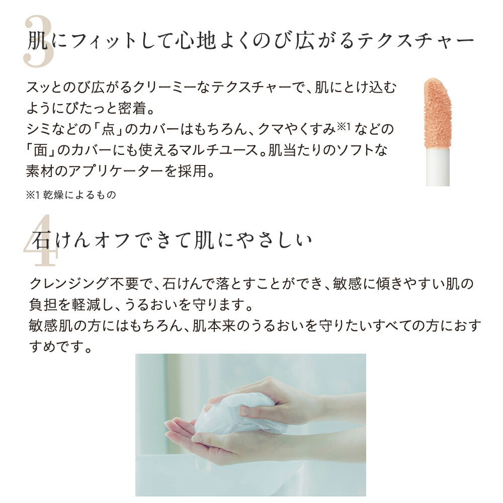 SPF36・PA+++ concealer that seamlessly blends into the skin like skincare and firmly fits, covering blemishes, dark circles, and dullness (caused by dryness). It provides moisture to the skin with skincare effects, making dry fine lines less noticeable (efficacy tested). Despite its creamy texture, it has a light, non-sticky feel, leaving the skin moisturized with a soft and smooth finish. Additionally, the soft-focus effect makes skin texture and pores less noticeable, resulting in a refined complexion.