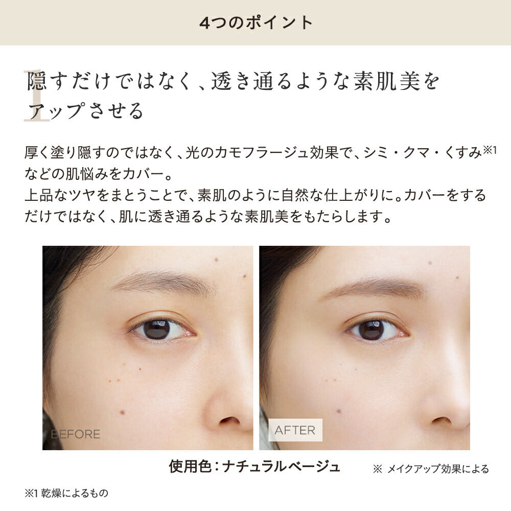 Point 3: Instead of heavily masking, it uses the camouflage effect of light to cover skin concerns like spots, dark circles, and dullness, providing a natural finish with a refined luster.