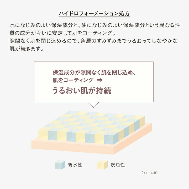 Point 1: Focuses on changes in skin structure due to dryness, providing care ingredients to prepare the skin's foundation. It contains a high-moisture design like a beauty serum, achieving a natural finish without dryness or powdery appearance. The inner treatment effect allows moisturizing ingredients such as human-type ceramides, sodium hyaluronate, poppy extract, and yuzu fruit extract to penetrate every corner of the stratum corneum. The Hydro Formation prescription coats the skin without gaps, locking in moisture for a fresh and natural finish, making dry fine lines less noticeable (efficacy tested).