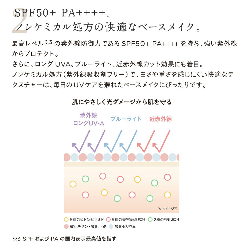 Protects against strong UV rays with the highest level of defense, SPF50+ PA++++, and also focuses on long UVA, blue light, and near-infrared cutting effects. The non-chemical formula (free from UV absorbers) provides a comfortable texture that doesn't feel white or heavy, perfect for daily UV care as part of base makeup. ※ The highest domestic value for SPF and PA labeling is indicated.