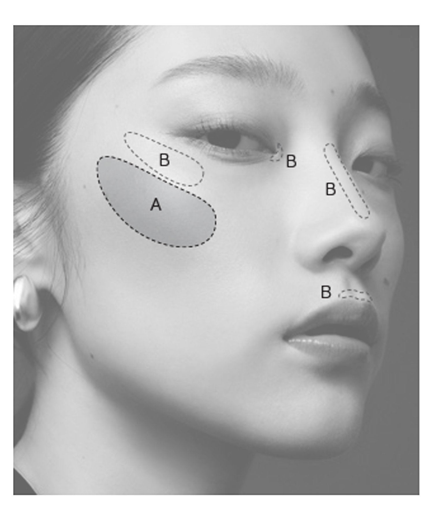 - B (Reflect Glow): Apply to high points to enhance bone structure, such as the tops of the cheekbones, bridge of the nose, cupid’s bow, and inner corners of the eyes.