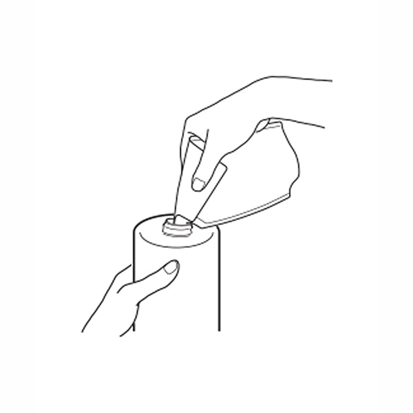 3. Insert and secure the spout into the bottle, then hold the refill with one hand and pour in slowly as illustrated.